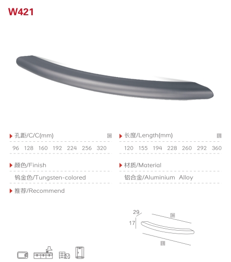 Item code: W421 Article Name: Furniture Handle Main Material: Aluminium Alloy Color/Finish: Tungsten-Colored L:120mm C:96mm L:155mm C:128mm L:194mm C:160mm L:228mm C:192mm L:260mm C:224mm L:292mm C:256mm L:360mm C:320mm