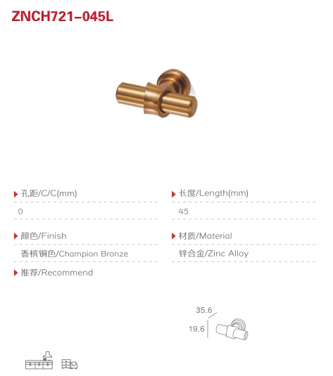 产品编号: ZNCH721-045L 产品名称: 家具拉手 主要材料: 锌合金 产品颜色: 香槟铜 L:45mm C:0mm