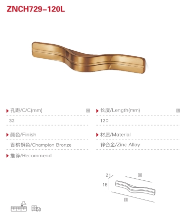 产品编号: ZNCH729-120L 产品名称: 家具拉手 主要材料: 锌合金 产品颜色: 香槟铜 L:120mm C:32mm