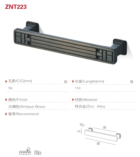 产品编号: ZNT223 产品名称: 家具拉手 主要材料: 锌合金 产品颜色: 青古铜 L:110mm C:96mm