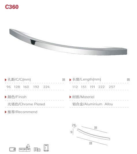 Item code: C360 Article Name: Furniture Handle Main Material: Aluminium Alloy Color/Finish: Chrome Plated L:112mm C:96mm L:151mm C:128mm L:191mm C:160mm L:222mm C:192mm L:257mm C:224mm