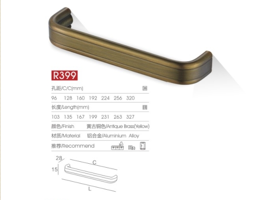 编号: R399 名称: 铝合金家具拉手 材质: 铝合金 颜色: 黄古铜色 包装: 塑料袋+纸箱